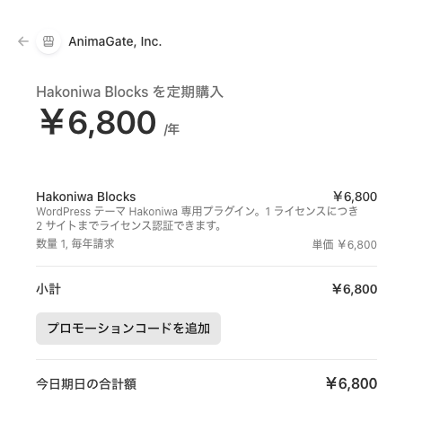 Hakoniwa では、オンライン決済サービス Stripe の「Stripe Checkout」を使っています。次の画像のように、割引用のプロモーションコードの入力欄を追加したので備忘録として書きました。