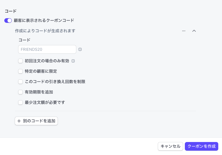 次に「コード」のトグルをオンにすると、プロモーションコードを作成するフォームが表示されます。