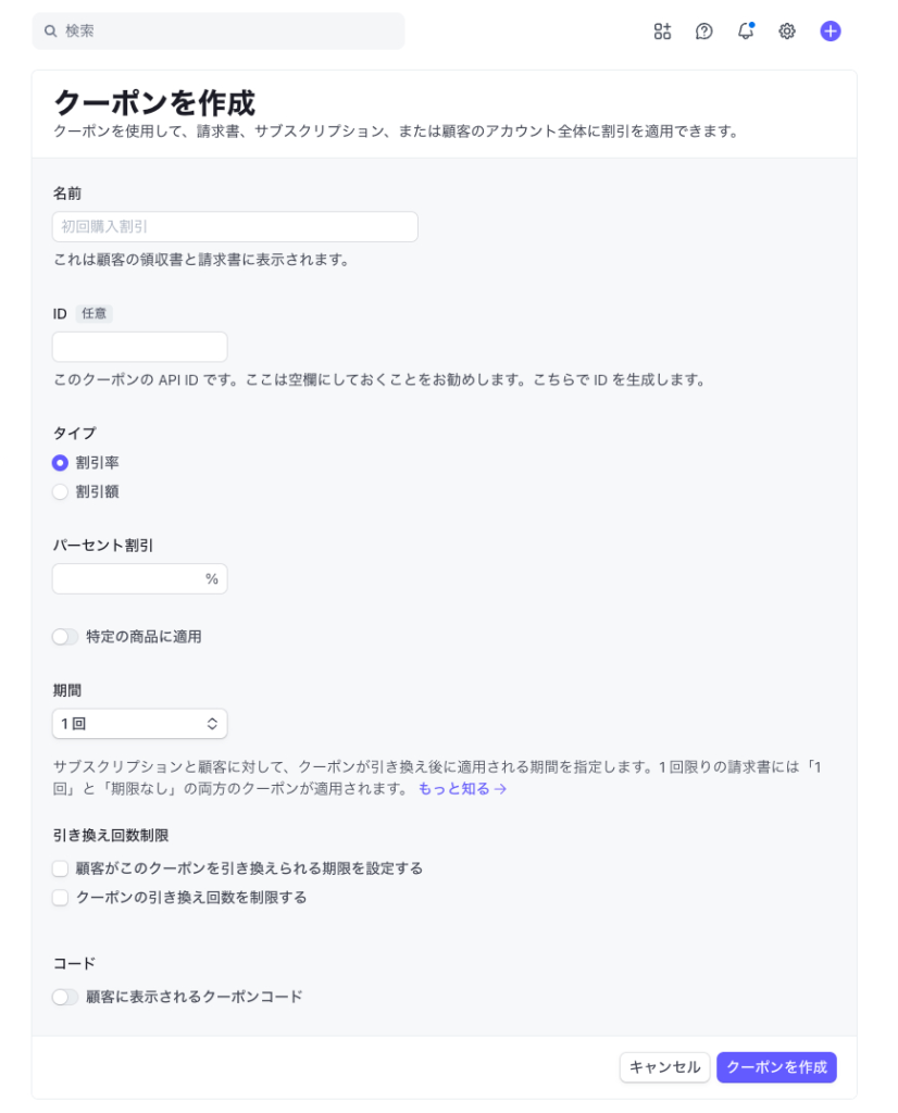 ダッシュボードの「商品カタログ」から「クーポン作成」を選択すると、次のような画面が表示されます。